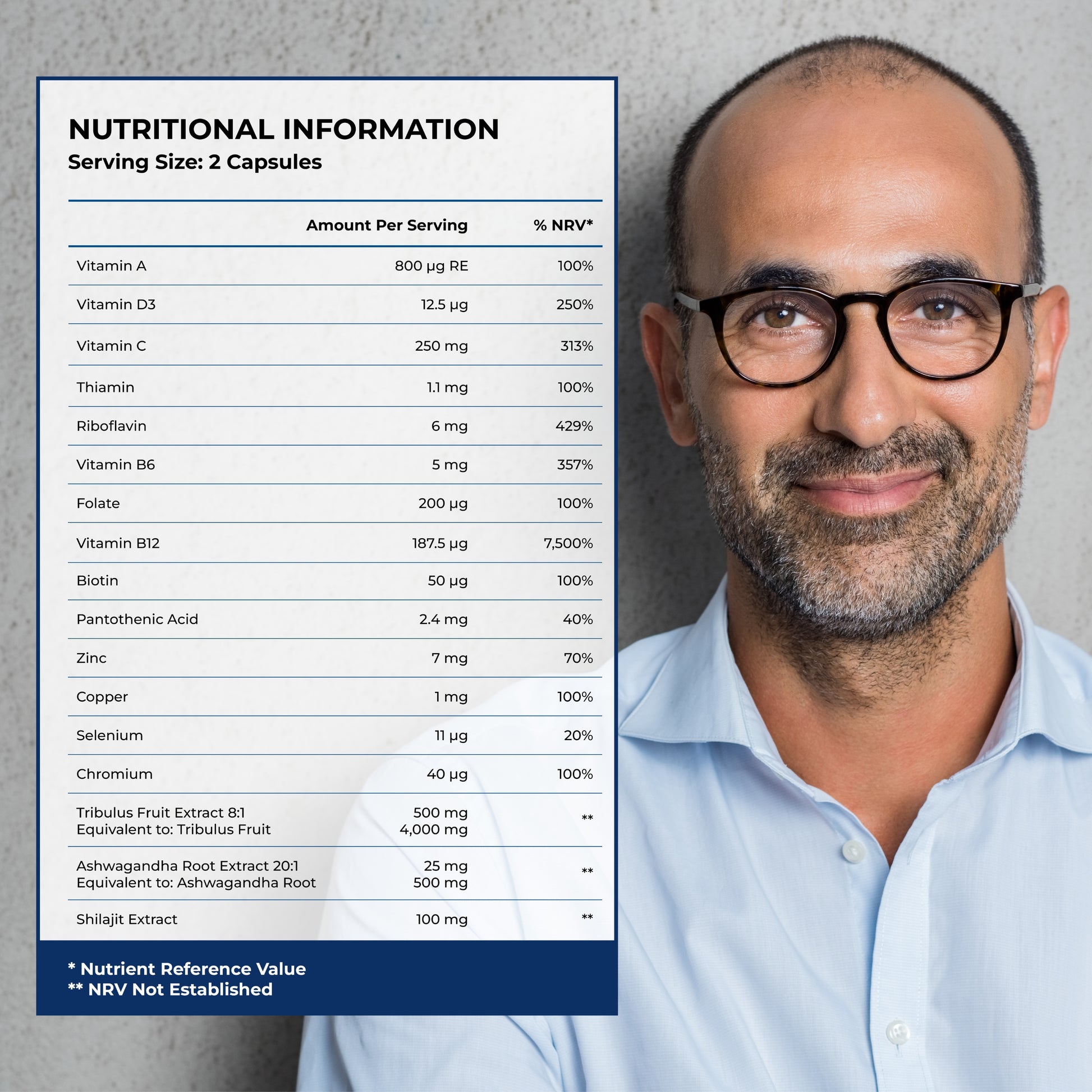 Health & Him Night Multi-Nutrient Support:| Nutritional Information | Average Per Daily Dose | Percent NRV |