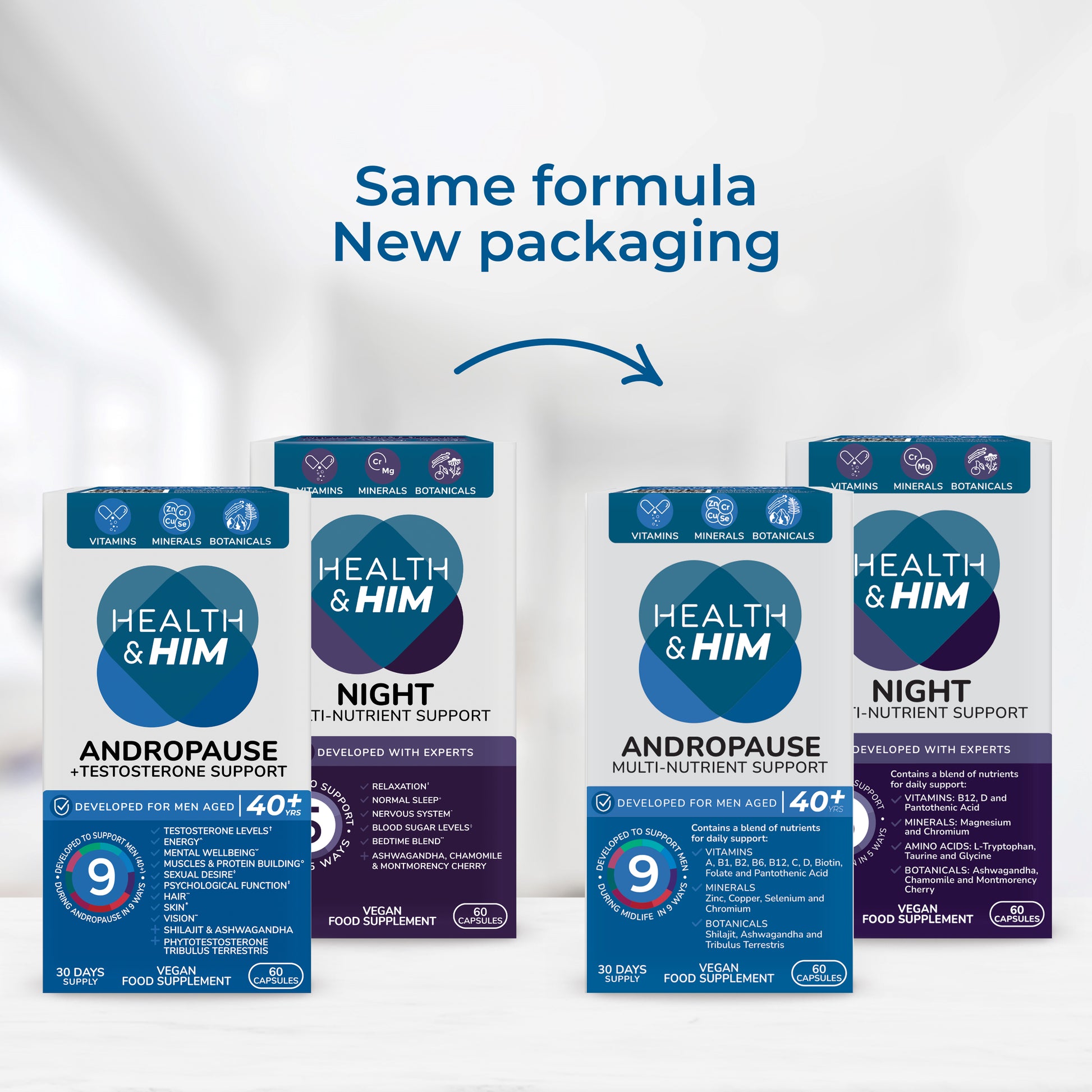 Health & Him Andropause 40+ is developed to support men during andropause in 9 ways: