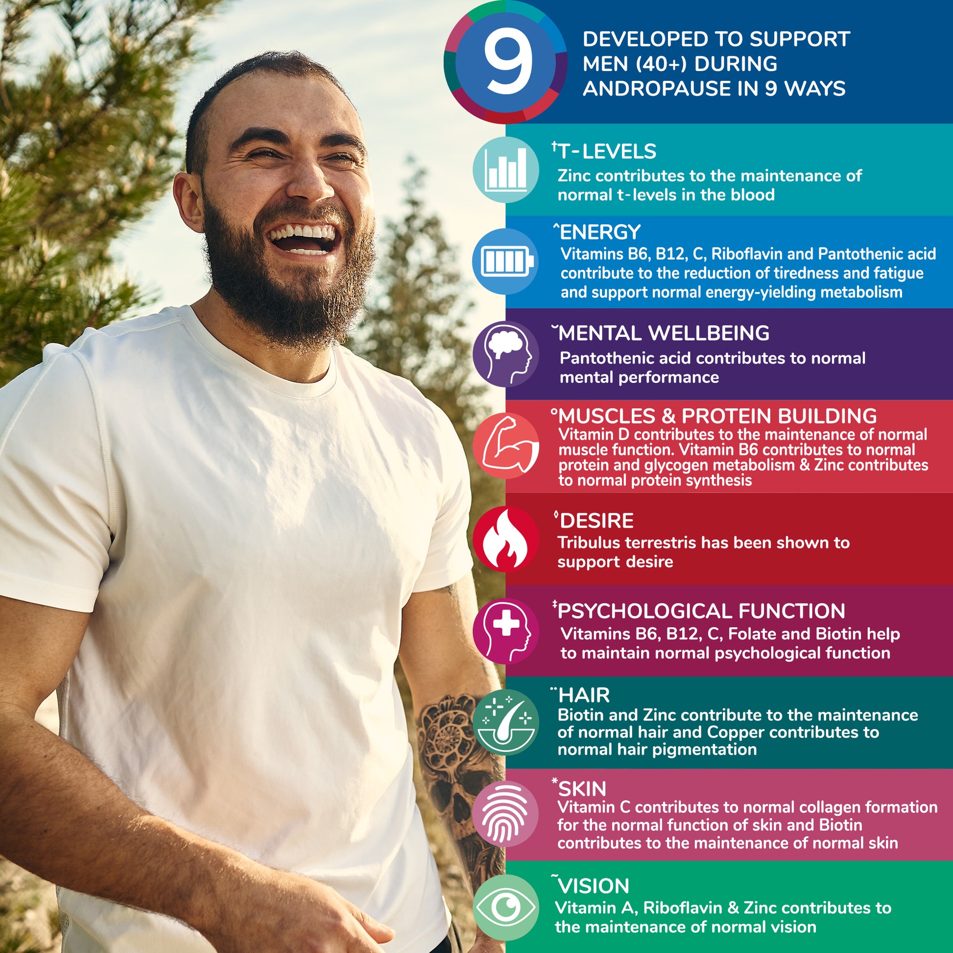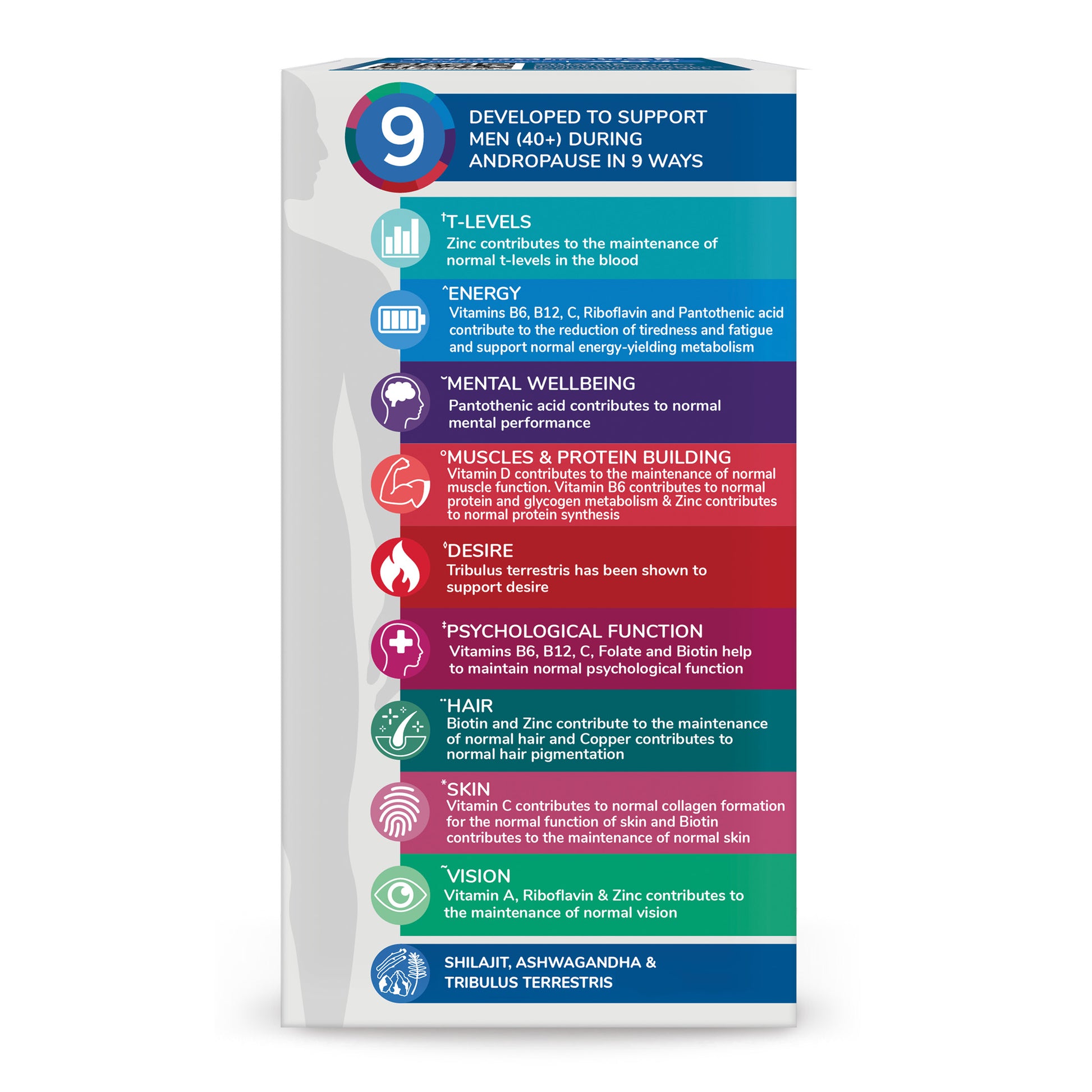 Health & Him Andropause 40+ is developed to support men during andropause in 9 ways: