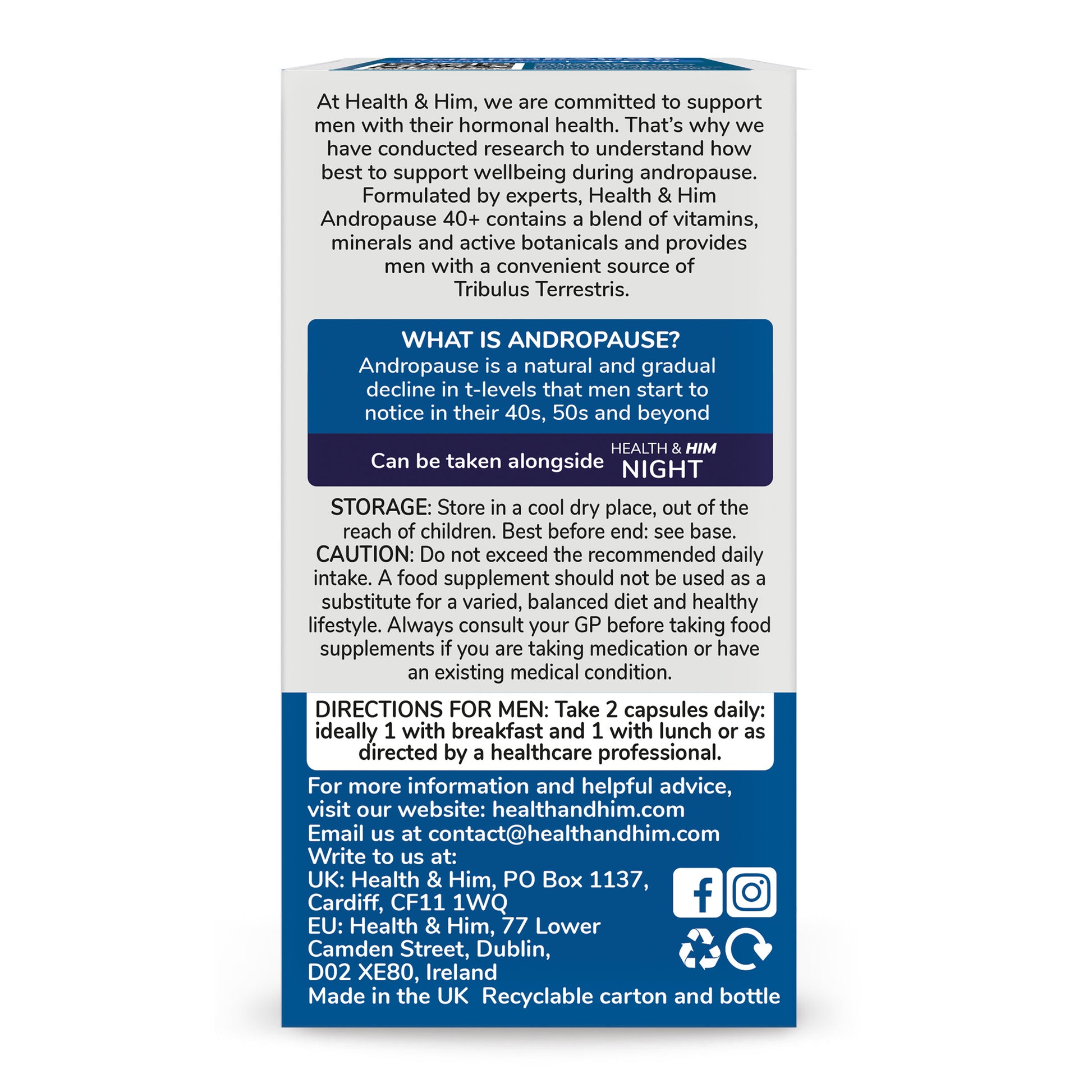 At Health & Him, we are committed to support men with their hormonal health. That’s why we have conducted research to understand how best to support wellbeing during andropause. Formulated by experts, Health & Him Andropause 40+ contains a blend of vitamins, minerals and active botanicals and provides men with a convenient source of phytotestosterone.