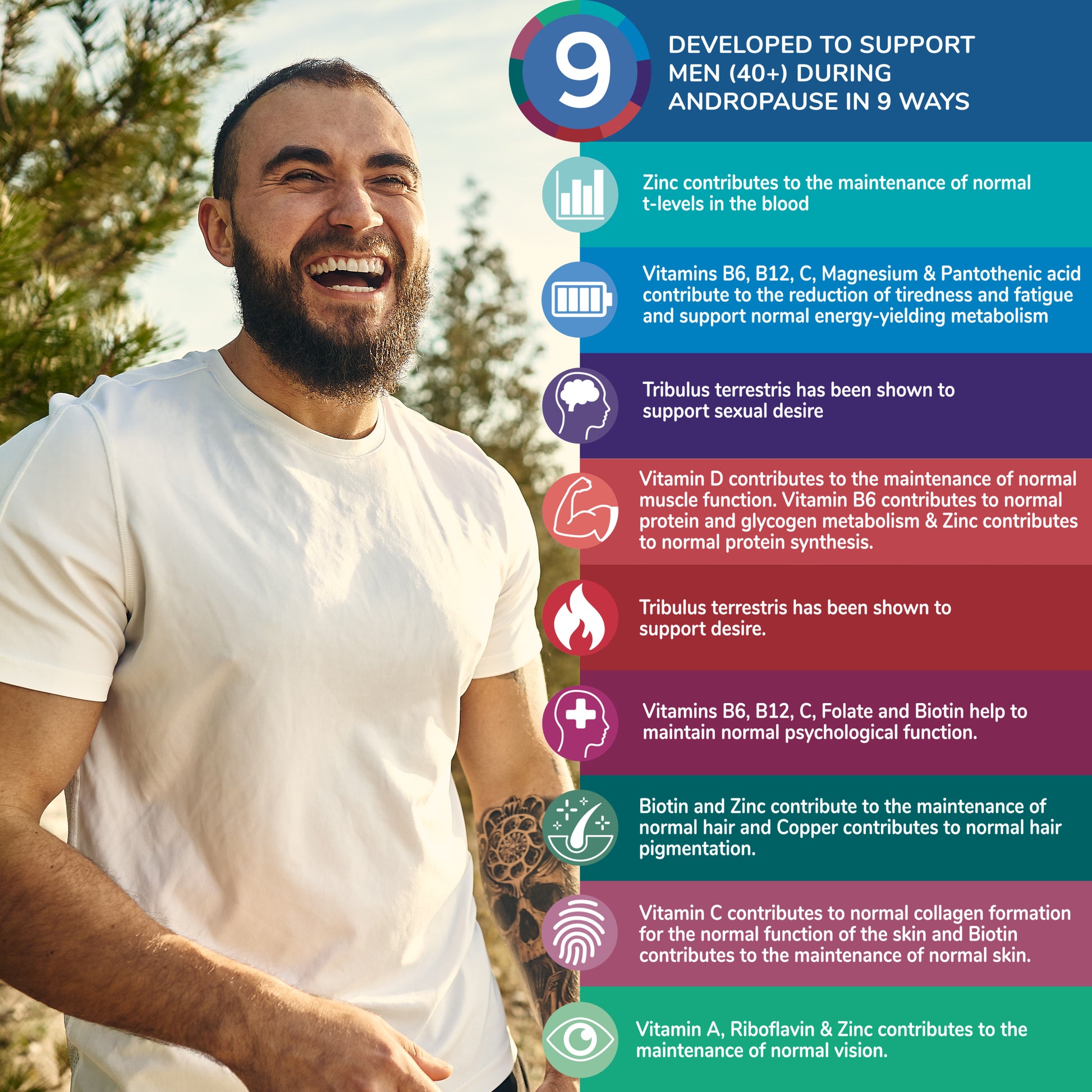 Health & Him Andropause 40+ is developed to support men during andropause in 9 ways: