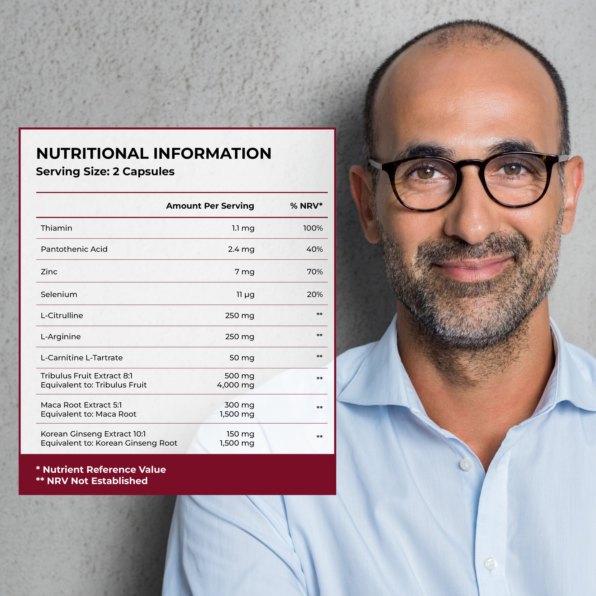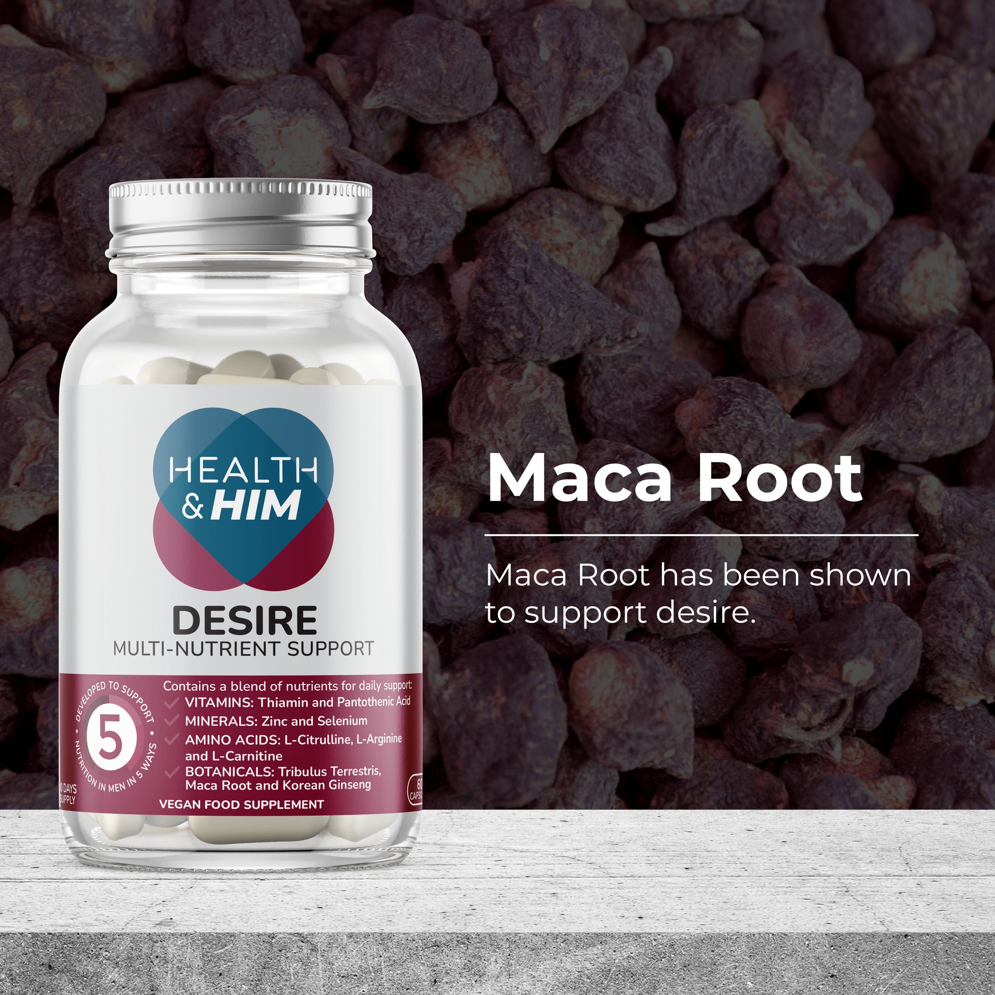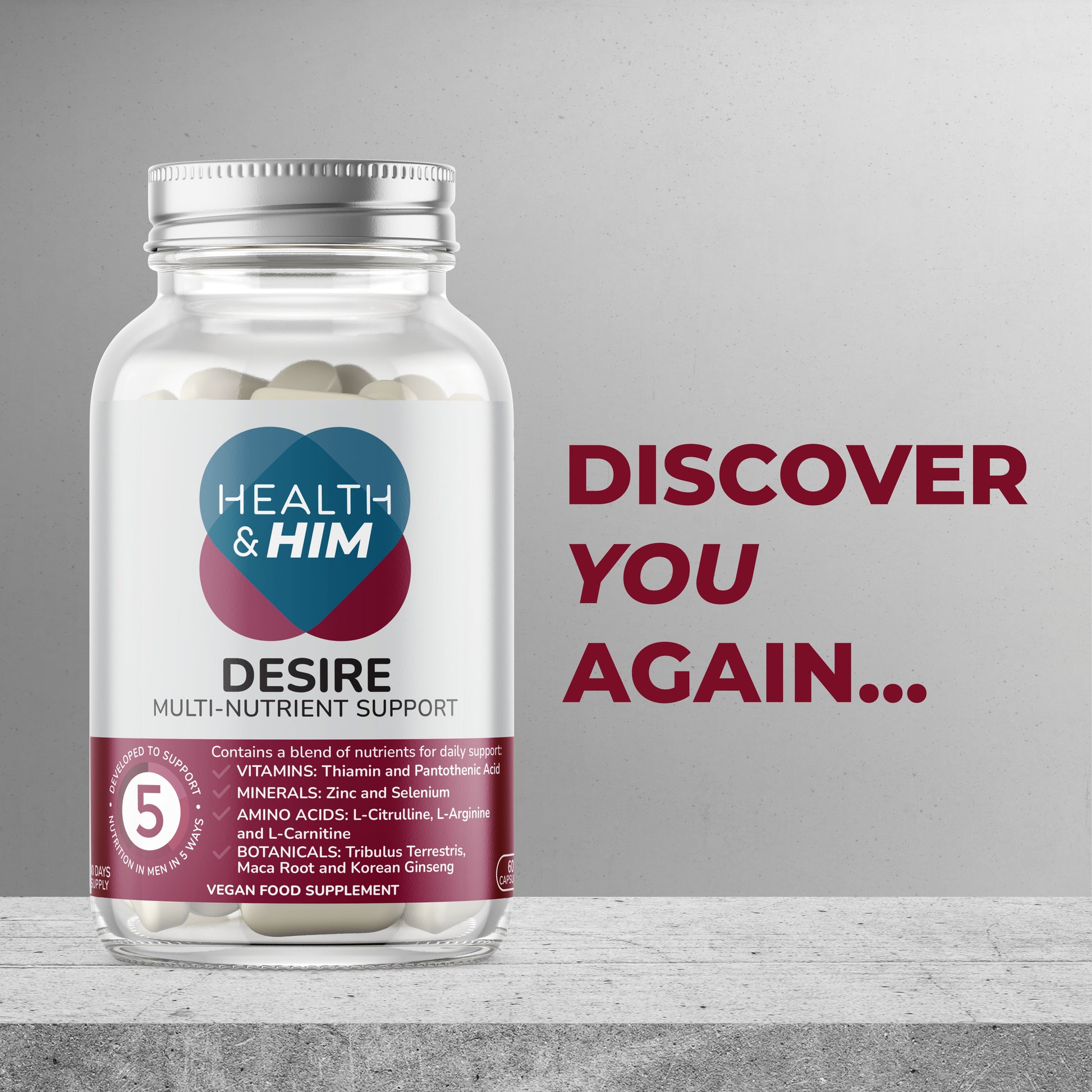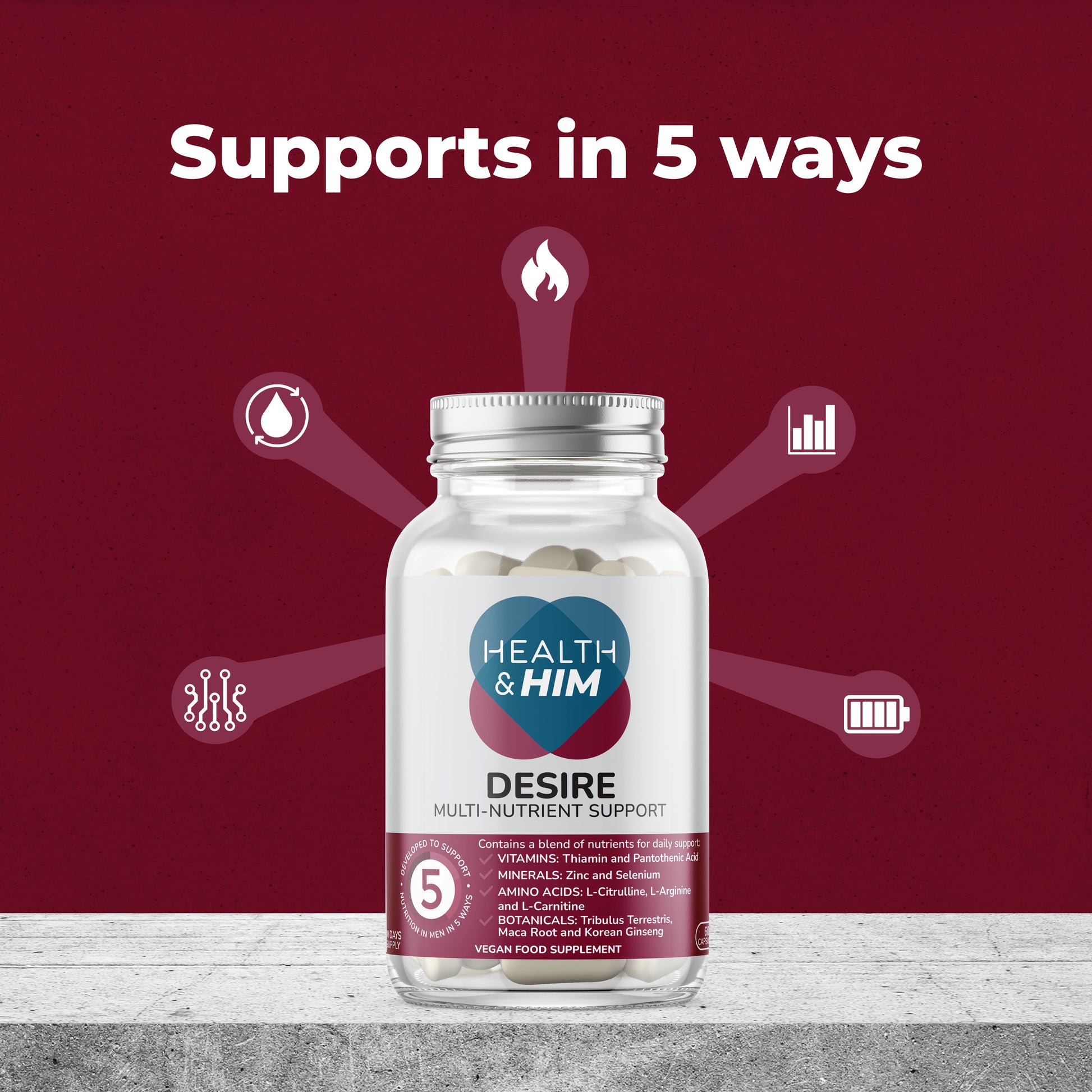 At Health & Him we are committed to support men’s health. That’s why we have conducted research to understand how best to support men's wellbeing. Formulated by experts, Health & Him DESIRE Multi-Nutrient support contains a blend of vitamins, minerals and active botanicals and is designed to support men in 5 ways.