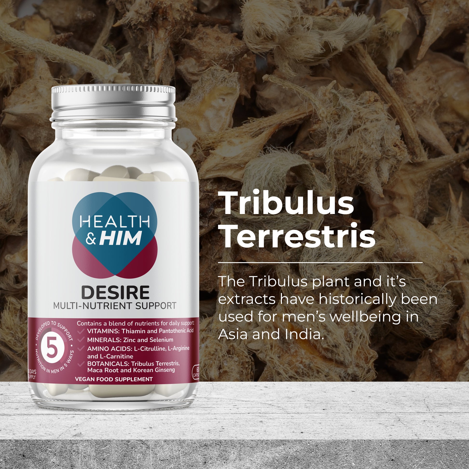 As sexual desire is a crucial health area to support during andropause, we also decided to include Tribulus Terrestris in the Health & Him Andropause 40 and Andropause 55 supplements at exactly the same dosage. Therefore, if you are taking either of these two products, we would advise against taking the Health & Him Desire Multi-Nutrient supplement in addition.