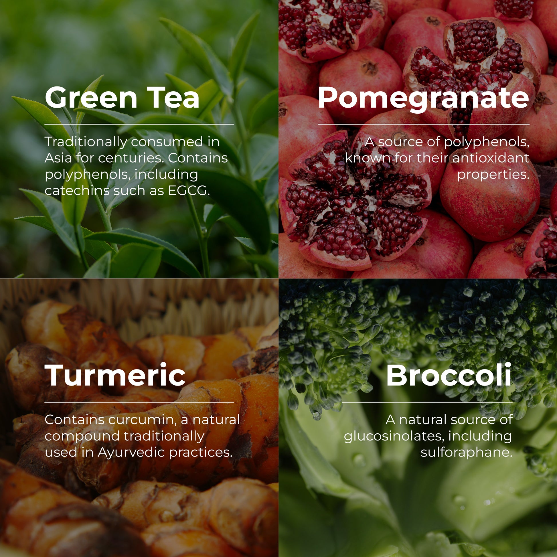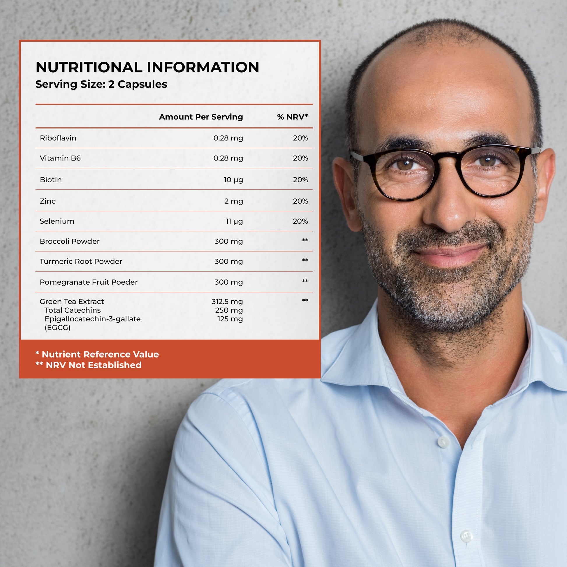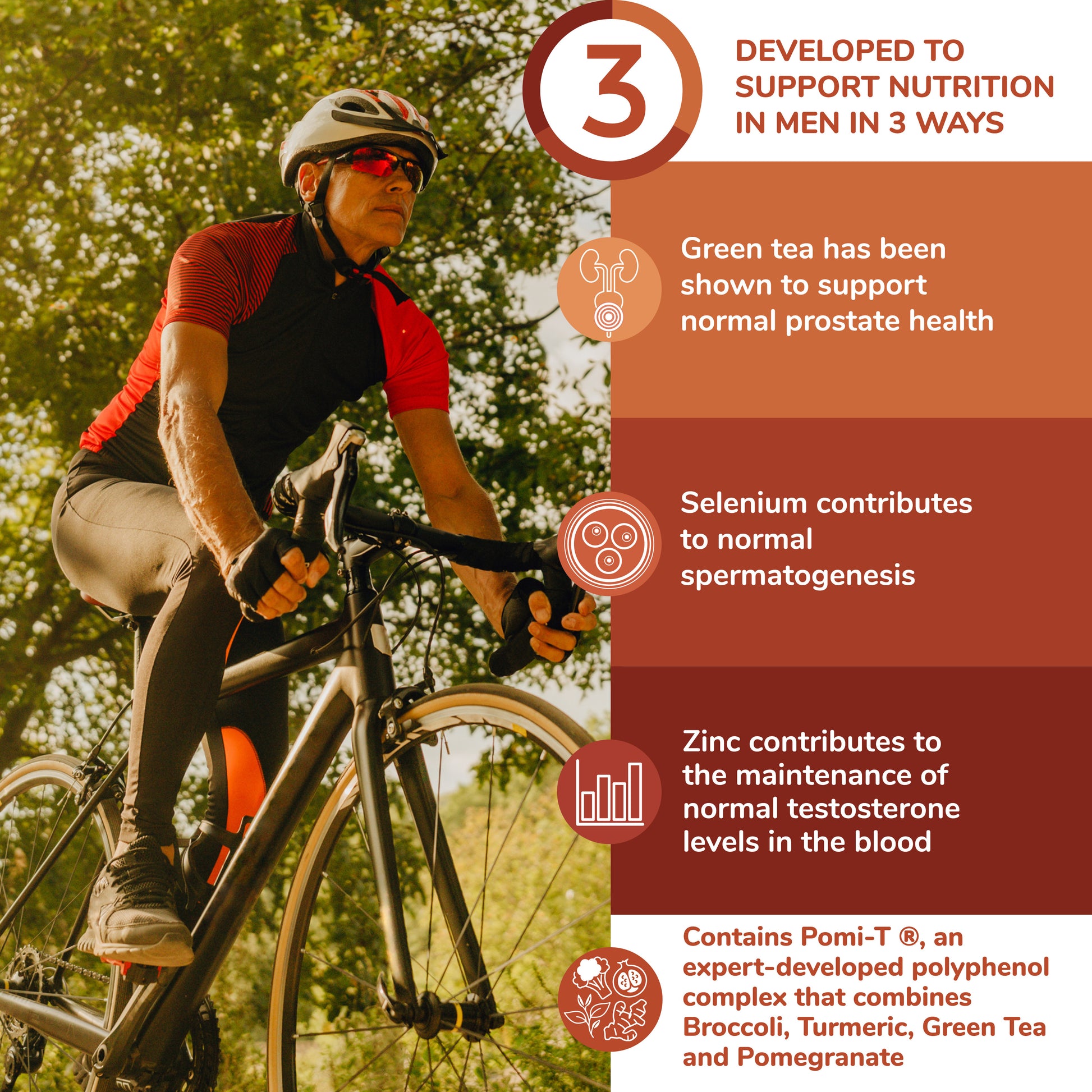 At Health & Him, we are committed to support men with their wellbeing. That’s why we have conducted research to understand how best to support men's nutrition during their midlife and beyond. Formulated by experts, Health & Him ProstaGuard ™ Multi-Nutrient Formula contains Pomi-T ®, an expert-developed polyphenol complex that contains Turmeric, Pomegranate, Broccoli and Green Tea.